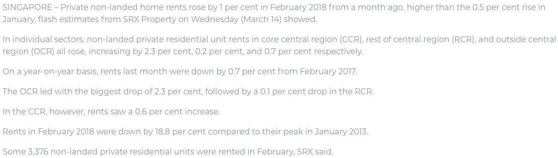 The rental prices for Condos in Core Central Region (CCR), Rest of Central Region (RCR), and Outside Central Region (OCR) all increased in Feb 2018. In the same month, the rents for HDB rose as well.